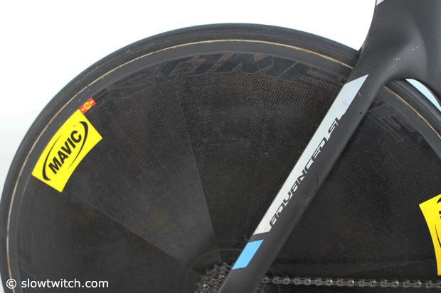 Sticksy rides a Mavic Comete disc wheel in the back.