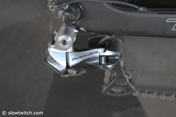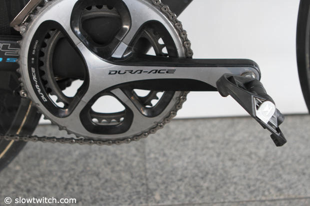 The hasty photographer somehow did not manage to capture the complete 172.5mm Shimano Dura-Ace 53/39 crankset. Sad but true. The pedals here are by the Kiwi brand Keywin.