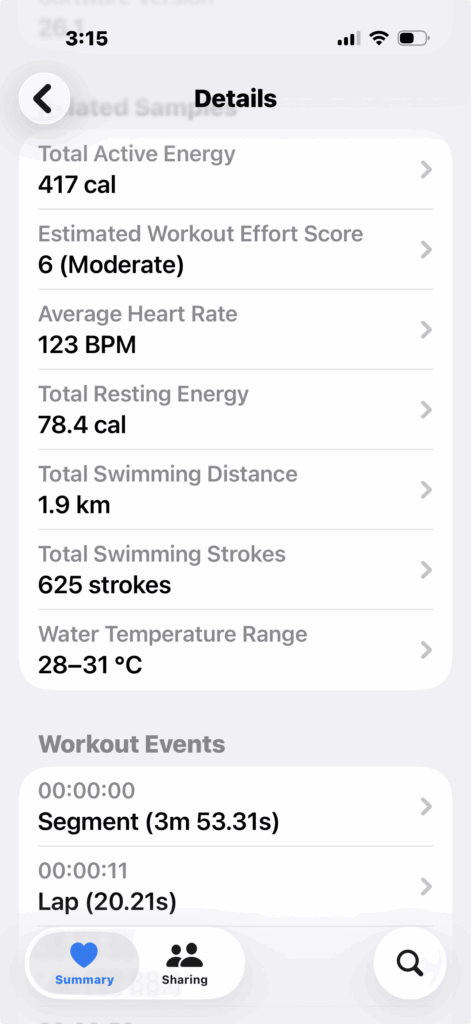 When it comes to swimming, athletes I coach know full well that I’m not a fan of people using watches in the pool – a pace clock is all you need. (When was the last time you saw any elite swimmers pressing a button on a watch at the end of all their intervals?) I do like the idea of keeping track of my total meters and training, so I am not averse to wearing a watch during a workout – I just don’t like people constantly stopping and starting their watches during a workout. So, I just let things run. What’s interesting, though, is that the Apple Watch Series 11 (and the Ultra), will provide lap times for those who are really keen to see exactly how fast they were going.