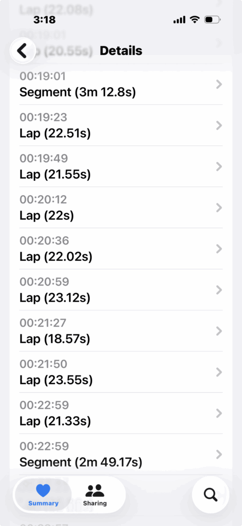 So, for me, the most important data was the total number of meters – I was pleasantly surprised that the Series 11 kept track of my kicking distance. Below you can see how it broke out lap and segments during the set, too.