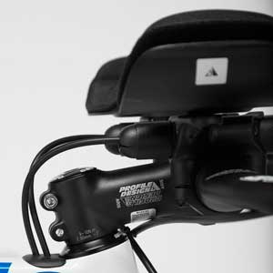 The cockpit is dominated, as noted, by Profile Design and its very comfortable F35 pads, T4 aerobar extensions, and Profile’s Aris stem in a +/-6° pitch. Profile also supplies the brake levers. The levers are an OEM variety that allow for clean internal routing and easy servicing with the clamp adjustment bolt accessible with the cable installed.