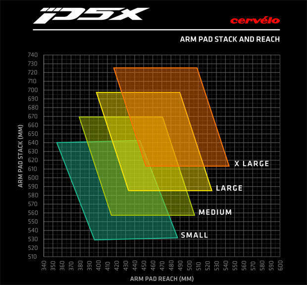 The P5X is built in 4 sizes. The bike uses stack and reach as frame inputs, which means if you use a pad x/y sizing system it’s entirely scalable. They’ve chosen to use x/y to the back of the pad, and the pad is about 90mm long fore/aft, so if your nomenclature goes to pad-center then subtract 45mm and you’re ready for this fit system.