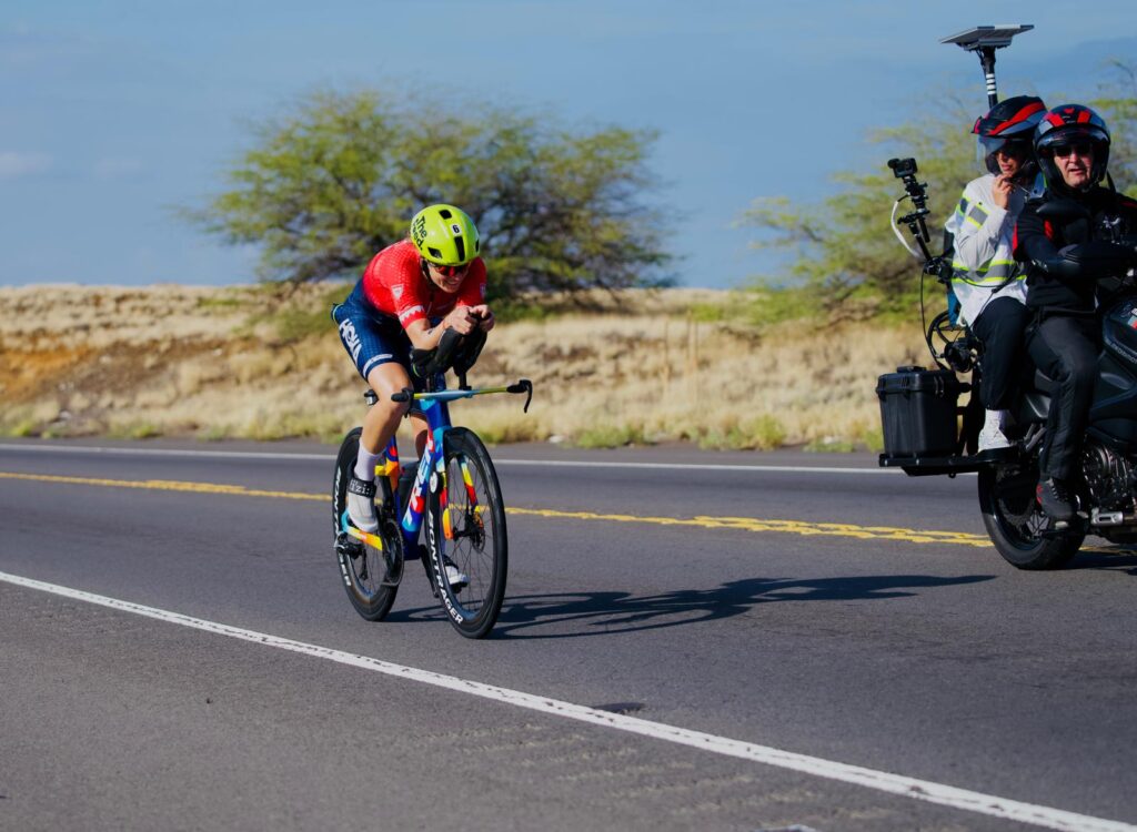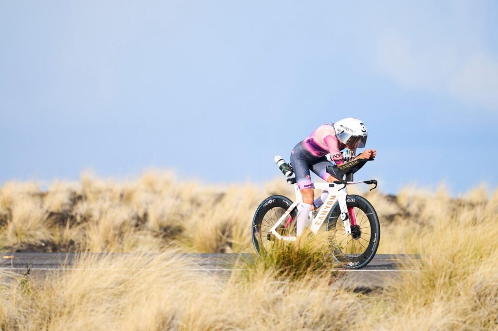 Lucy Charles-Barclay was the first woman out of the water in Kona on Saturday morning, and by the bike turnaround at Hawi, she had not only held onto the solo lead, but put time into the entire field other than Taylor Knibb. She hit Hawi in just under three hours and 20 minutes, only seconds ahead of the second-place Knibb. Knibb was the only athlete anywhere close to Charles-Barclay at that point in the race, with Norway’s Solveig Løvseth riding alone in third place more than seven minutes back.