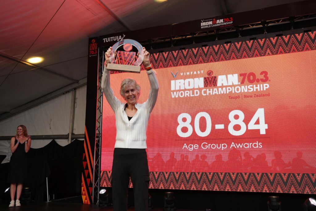Cherie Gruenfeld wins her age group at The IRONMAN 70.3 World Championship Taupo. Photo: FinisherPix.