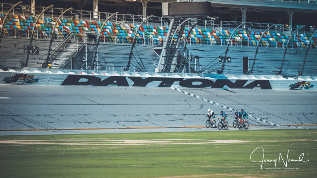 “We have got 24 teams here, teams of eight riders,” Lapar says. “You’re on pit road at the World Center of Racing – I mean, it’s an iconic backdrop. It’s a fun format for racing a bicycle – you have your team there with you at the pit stall, you’ve got two of your riders out on the track at any given time, then you have to pull into the pits to do the relay baton exchange – we have the timing chips inside of a water bottle, so you’re only as fast as your slowest team member because you got to keep those two athletes together. It’s just the camaraderie along pit road between the different teams, and the smack talking, and it’s just a cool, different way to ride and race a bicycle.”