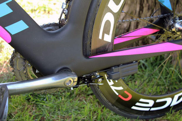 The view from the non-drive side shows the Di2 battery and the brakes under the chainstays.