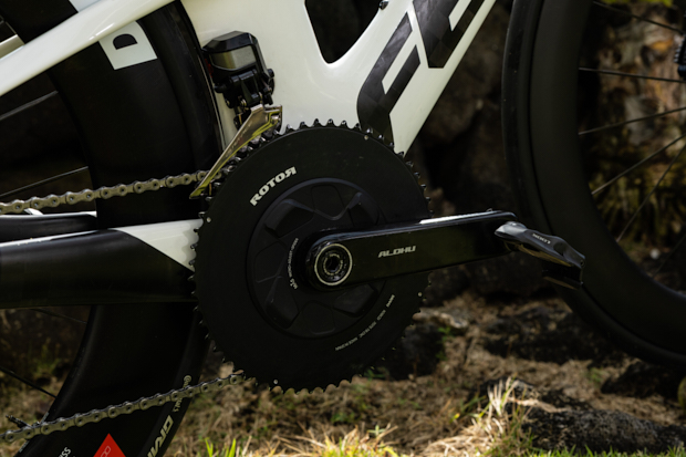 Breaking away from the rest of her drivetrain, it's a Rotor 56 tooth crank.