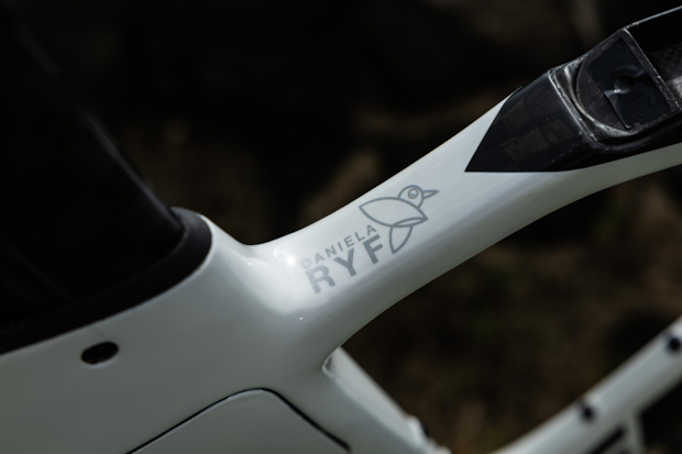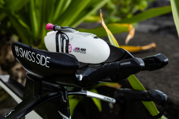 Ryf uses the X-Lab Torpedo Versa 500 (in pink!), tucked neatly between her bars.