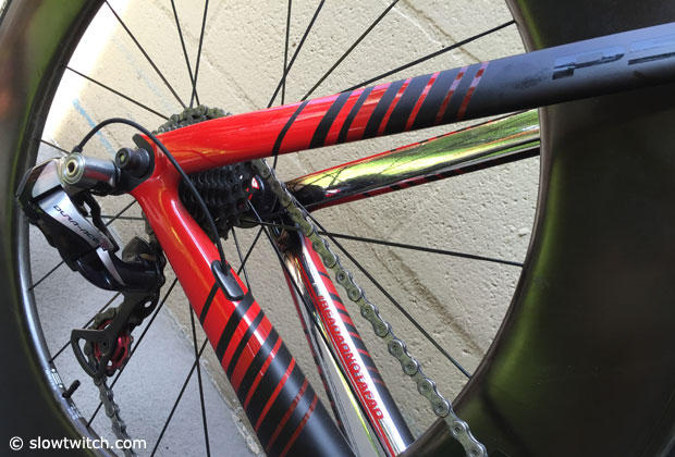 Shimano Dura-Ace Di2 derailleurs and a little red highlight on the outside where the seatstays and chainstays meet. More chrome and his logo Be A Dad Not A Fad on the inside of the stays.