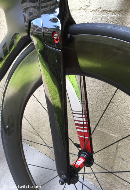 A glossy black Cervelo logo on the matte black frame is only visible at certain angles. But the frame is distinctive enough where one does not need to read the name to know what it is.