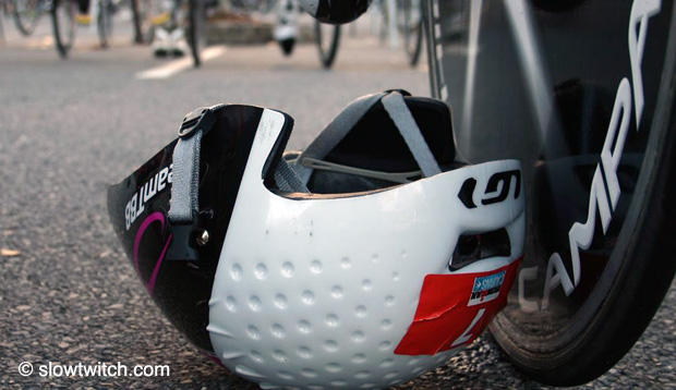 Dellow's Louis Garneau Vortice helmet with bib # 7 on the ground.