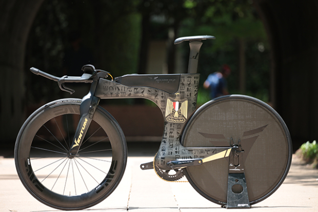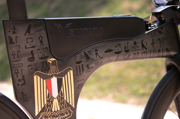 Ventum co-owner Diaa Nour is originally from Egypt and he wanted to have a bike that is a tribute to his home country. Currently at IRONMAN Texas this bike with very intricate hieroglyphs and golden details is on display in the expo there. An artist hand painted this Ventum One and what is golden there came from 24 carat gold sheets and not paint.