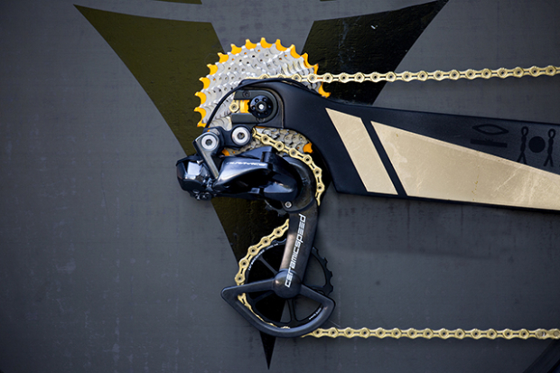 The golden detail on the chain stay are indeed from a gold sheet and not simply painted on. The KCNC titanium cassette is matched up to a Shimano Dura-Ace rear derailleur with a CeramicSpeed OSPW and a golden KCNC chain.