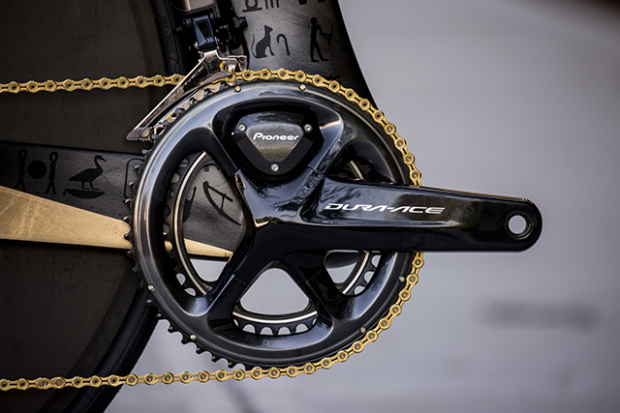 These beautiful hieroglyphs are even behind the Shimano Dura-Ace crank with the Pioneer power meter.