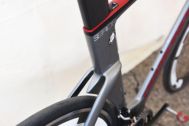 How do you raise the front end of the Serios, if you need it higher? By aerodynamic spacers that sit under the integrated stems. Look at the image above. You can see how flat the front end is, and it's got one of these aero spacers between the frame and the stem, raising the front-end a centimeter. You can stack these spacers. They interlock: up-up-up.
