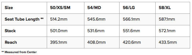 Compare this to a review just published yesterday. This bike here, the Serios, in size 56, has a stack and reach of 551mm and 421mm respectively. The Quintana Roo Prsix in size 54 has dimensions of 520mm and 425mm. The bikes are close to the same length, but the Serios is about 3 centimeters taller per that length. But the bikes fit more closely to each other than it would appear, because the QR's integrated front end is average to slightly tall, while the front end (integrated stem) of the Serios is very low, very flat.