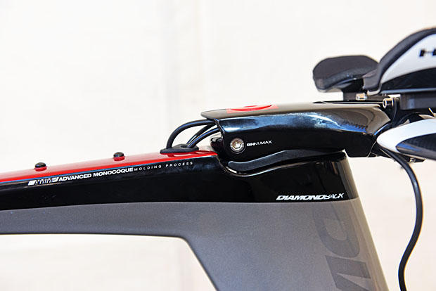 The bike is designed so that the steerer is cut absolutely to length, with a top cap that sits flush with the top of the stem. (You do see this in the image above, right? The patch of red in the otherwise black integrated stem?) Very slick. But, you are now locked into this height. You can go lower, but not higher. You've got to know you aren't going to need to move the bars higher.