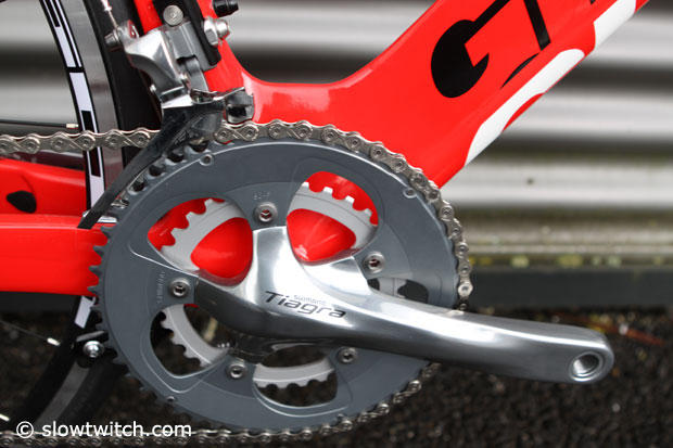 A Shimano Tiagra crank and front derailleur, but the rear derailleur is Shimano 105.