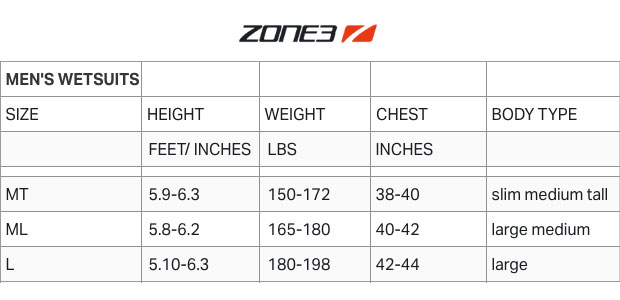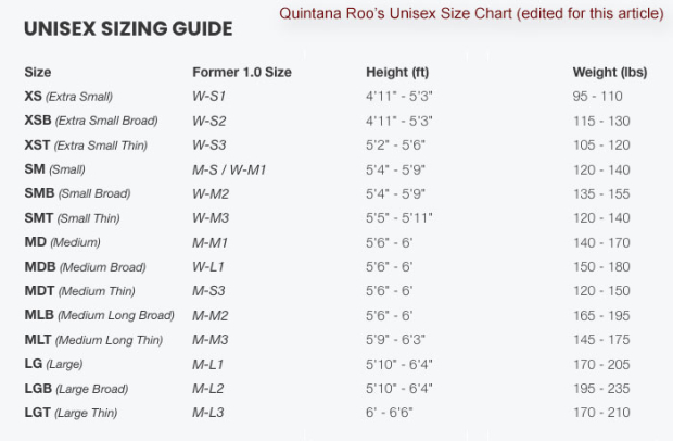 The second shortest suit in the lineup of 6 wetsuits in the image higher up is the Quintana Roo HydroSix2, and it’s a size LG. If you look at the size chart (QR's Unisex size chart is just below), this is the one that fits me.