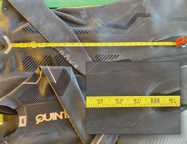 For me, measuring that torso panel in a wetsuit is a common-sense metric. That torso pattern piece, for my 6’2” height, needs to be between 23.5” and 24.5”, and when that piece measures taller or shorter the wetsuit is going to either be baggy in the stomach, with a roll of rubber there, or it’s going to be hard to get up over the shoulders, with a lot of pressure on my shoulders. The size LG in QR is a fine size, just, it’s not my size.