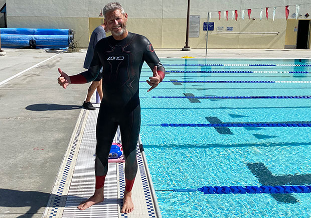 But that size fits somebody well. Above is my next door neighbor and training partner, Mark Montgomery, who tested the Zone3 Aspire in my stead. He stands about 5’10” and weighs 168lb (or so), so the ML should’ve fit him perfectly. In fact, it was a little smallish on him. Zone3 makes excellent wetsuits (review upcoming), but I question the ultimate accuracy of the size chart simply based on the suit in my possession.