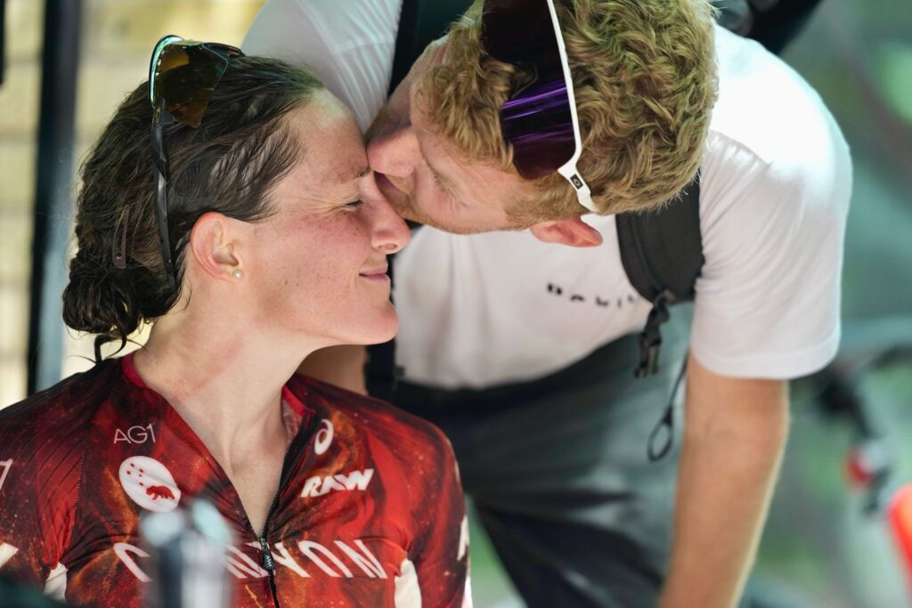 The new “IRONMAN record holder” (see below) is congratulated by husband Mark. Photo: Eric Wynn.