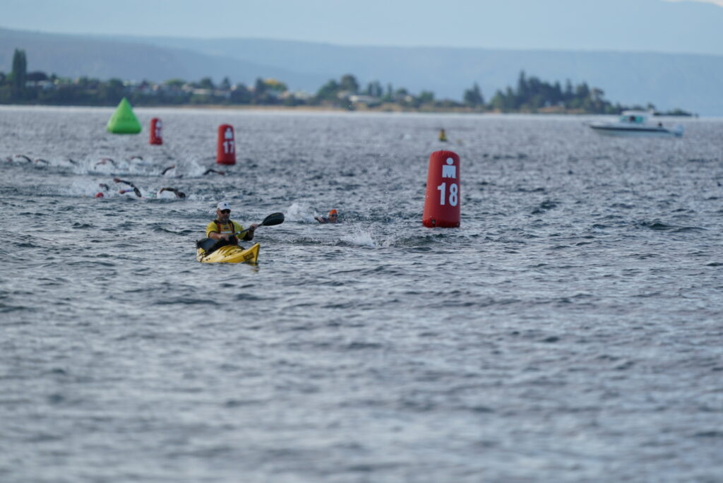Almost all of the pre-race favorites lined up on the far left side of the beach, closest to the first turn buoy, with defending champion Rico Bogen lining up the furthest to the left. As the airhorn sounded and athletes dove into Lake Taupō, it looked like the athletes on the left were making ahead, with Marc Dubrick leading the pack. The frantic pace saw athletes starting to be dropped before that first turn buoy, just 300 meters into the swim.
