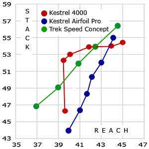 Because of this, I can plot Trek's size run, small to large, and this serves as a proxy for where the industry generally is. When you then consider Kestrel's size run, what you see is as follows: The Airfoil Pro gradually changes its posture, or theme, from long and low in the small size, to "orthodoxy" in its tallest size.