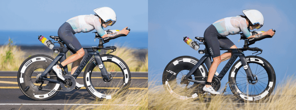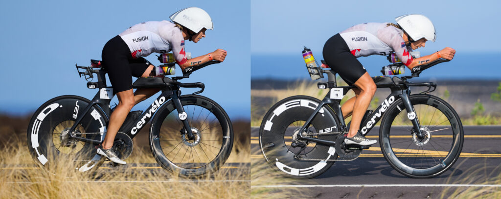 This is a perfect example of why a single photo can be misleading. In the first image on the left, Hannah appears in her all day position: forward on the saddle, looking ahead with a higher head position. In the second image on the right, she has slid back on the saddle, stretched out on the front, and tucked into a more aero posture. I assume she is still pedaling rather than coasting? The contrast shows how much an athlete can change positions simply by adjusting posture on the bike. This is a useful tool athletes can apply based on terrain, speed and race situation.
