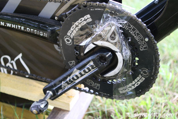 Rotor 3D cranks and Rotor chain rings, Speedplay pedals and a Power2Max power meter, covered here with tape for overnight protection from the elements.
