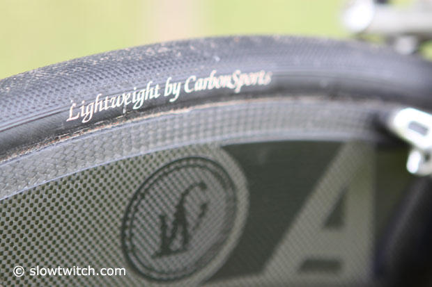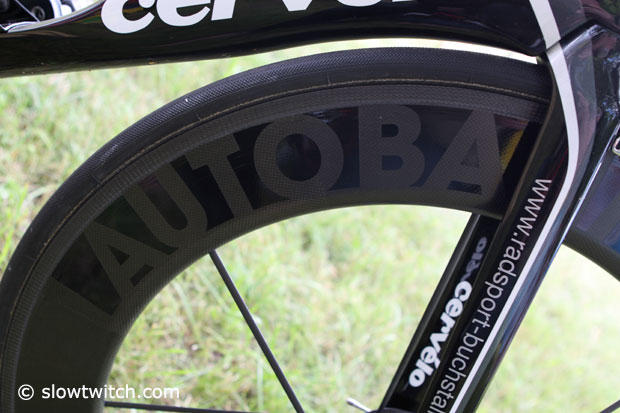 A Lightweight Autobahn front wheel with Continental Competition tires by Lightweight.