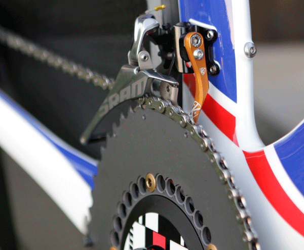 Kristin and her husband, mechanic Joe Savola, designed a chain catcher marketed by K-Edge. It's used here, but SRAM's own chain catcher will do the job nicely.