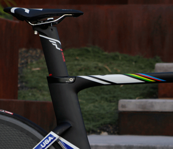 This is the seat post a UCI rule-encumbered rider is obliged to use. The standard seat post is pitched forward, for use in tri. At the terminus of this gallery you'll see a link to Andreas Böcherer's Felt DA. It's got that tri-specific seat post you'll probably want.