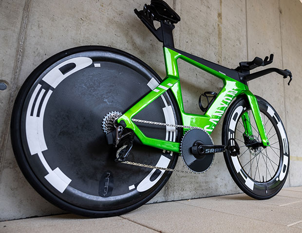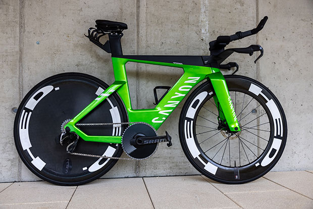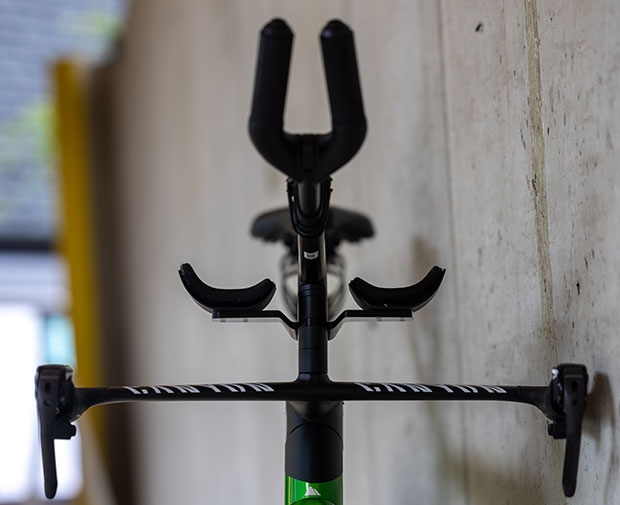 Of course, he’s not constrained by UCI rules in triathlon, specifically rules about BB-to-extension length, and about the degrees of aerobar angle.