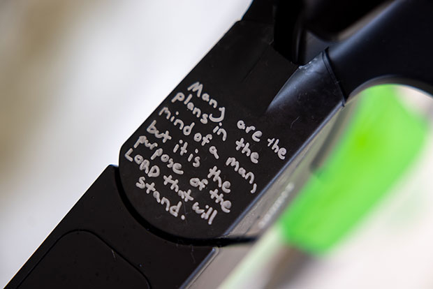 This is what Lionel sees when he rides. For those who have an interest, it’s Proverbs 19:21 and (because of course I had to check) it appears that Lionel’s translation choice is English Standard. As my eyesight is not what it used to be, I would have chosen the more succinct Proverb, 16:9, which conveys a similar ethic but which I could display in a larger font: “A man's mind plans his way, but the Lord directs his steps.”