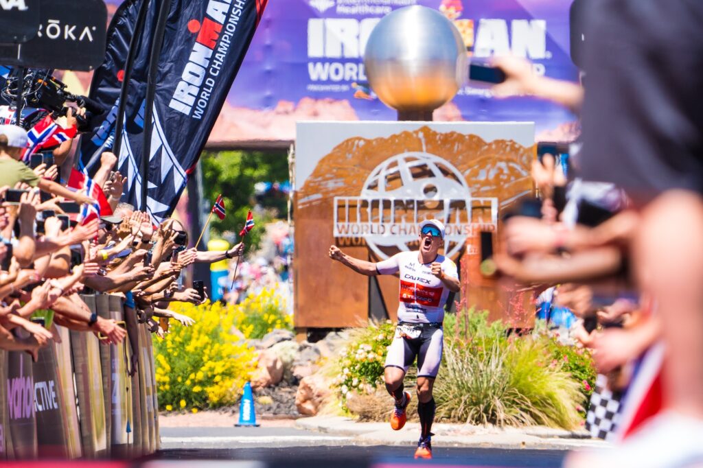 Kristian Blummenfelt celebrates his IRONMAN world title. Photo: Kevin Mackinnon