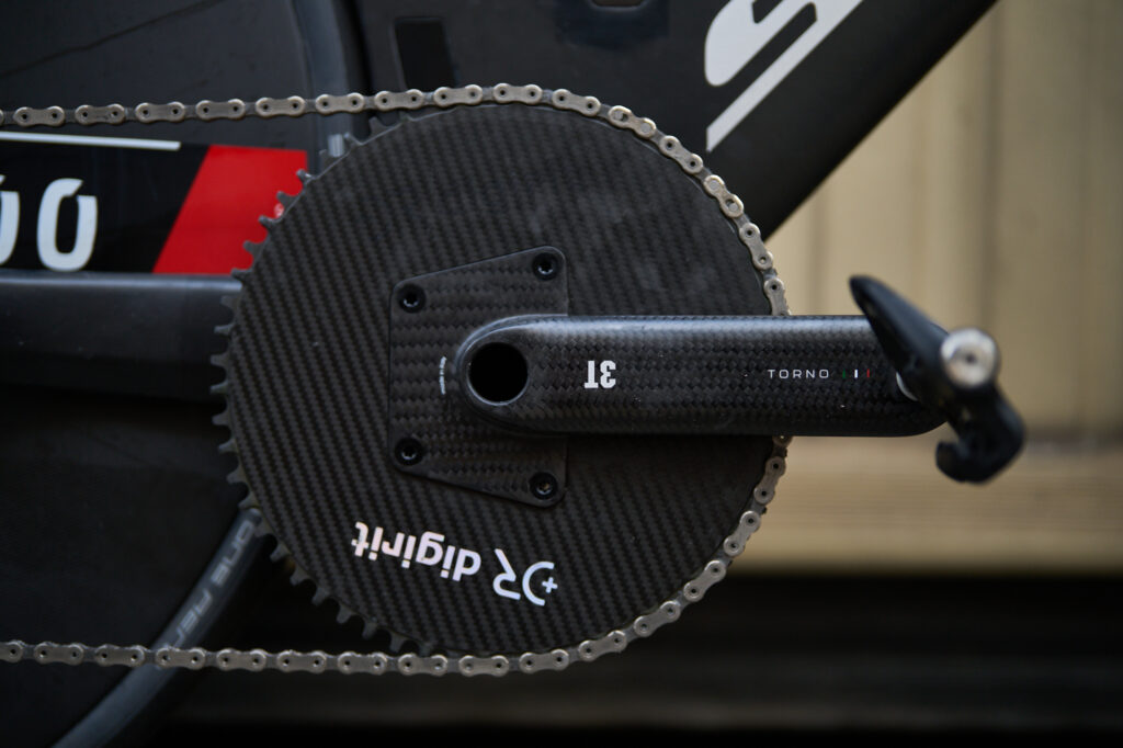 The 3T Torno crank features “a super-narrow q-factor,” according to Ditlev. It weighs under 350 g including the crank, spindle and integrated spider. It is only 1x compatible. That’s a 60-tooth chainring.