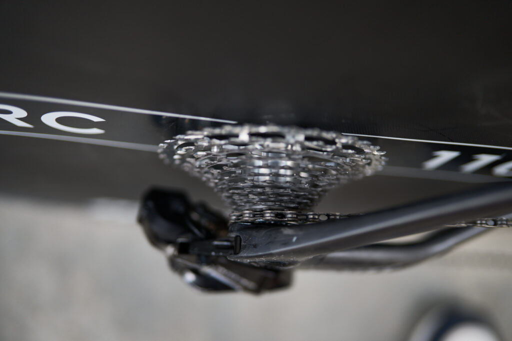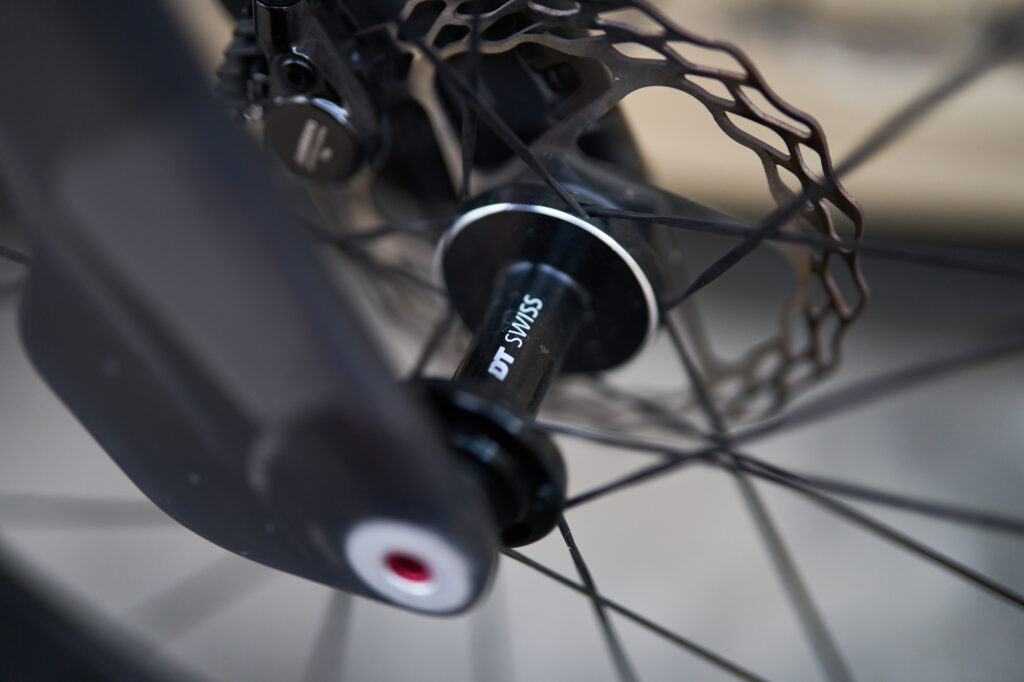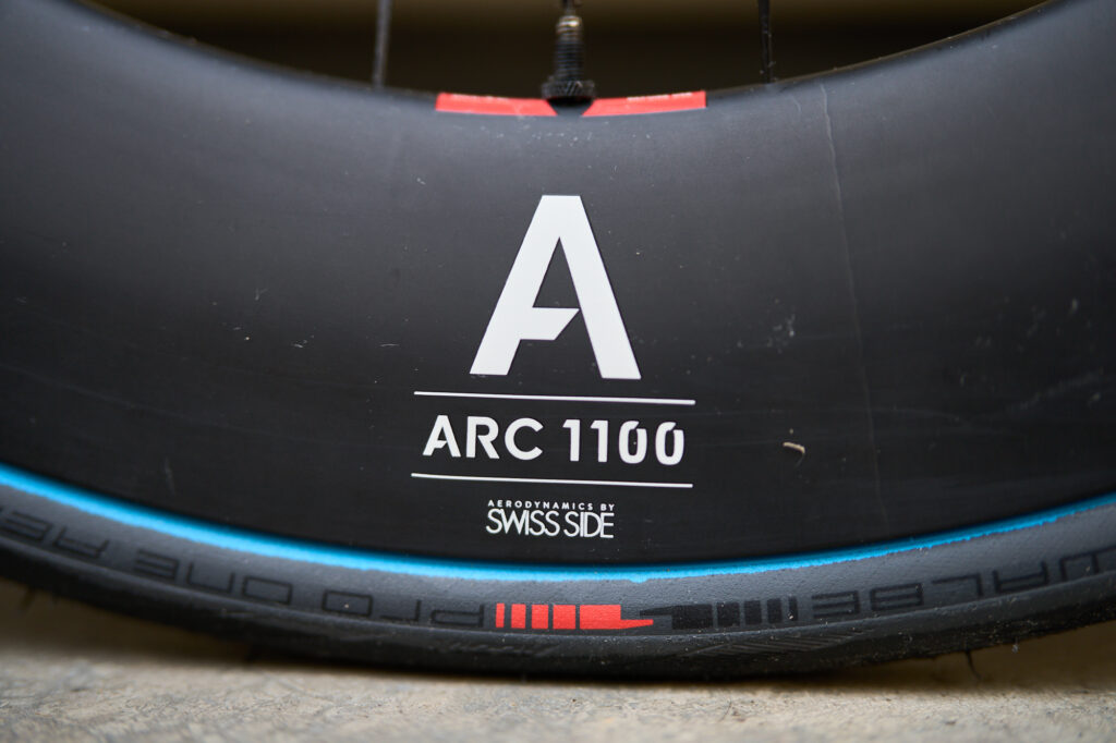 The DT Swiss ARC 1100 Disc is paired with the ARC 110 (85 mm) front wheel. He’ll ride Schwalbe Pro One Aero tires.