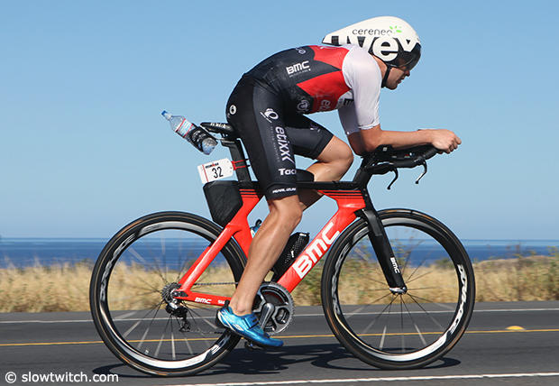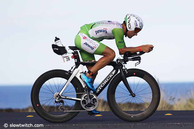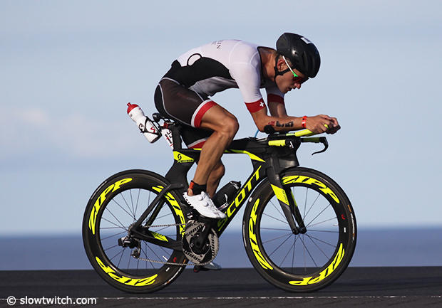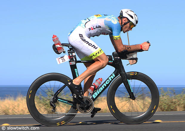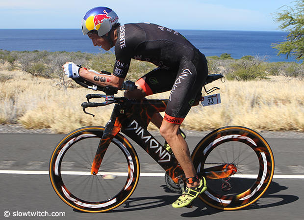American Jesse Thomas was near the front most of the race with a good swim and 4:34:13 bike time and in the end he finished 16th.