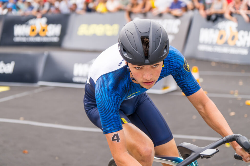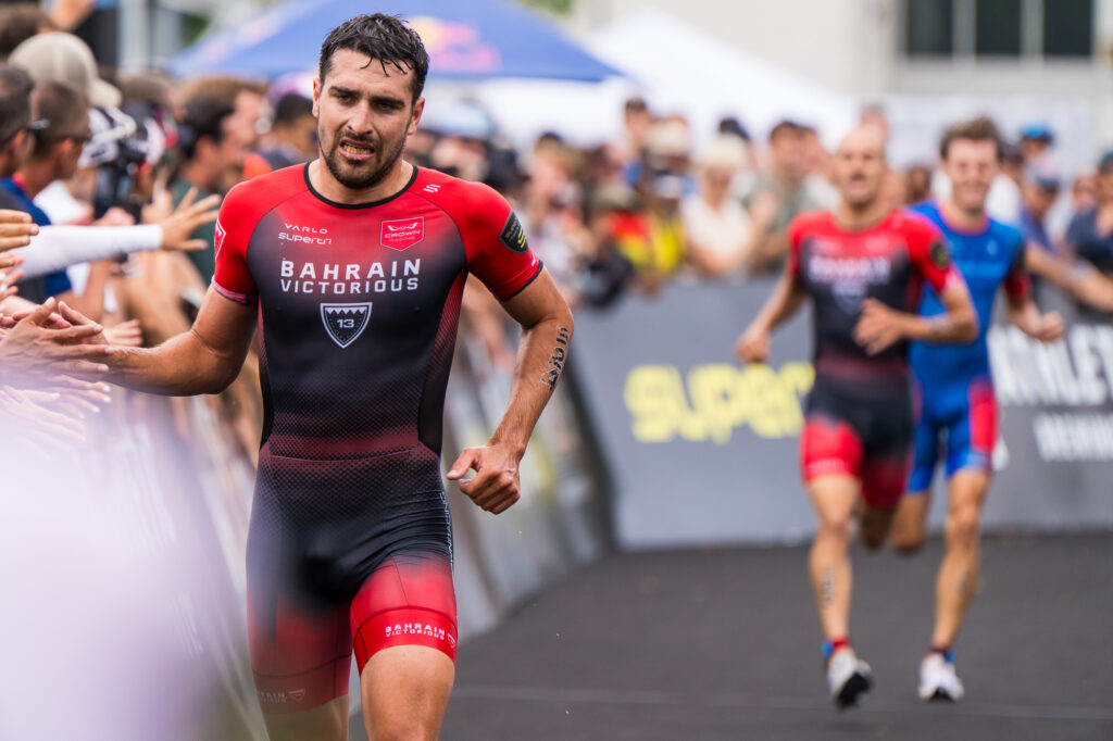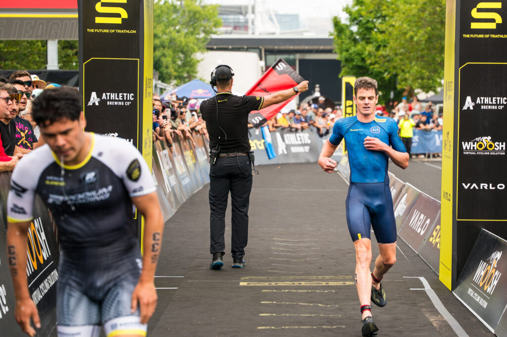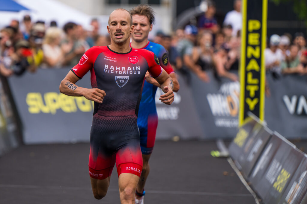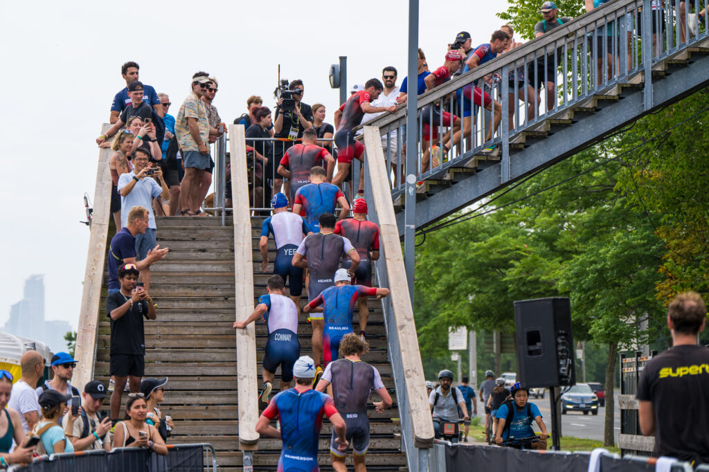 As with the women’s event, today’s race featured an “Eliminator” format that included three races of 300 m swim, 4 km bike and a 1 km run, with the final race featuring two loops of the run course. The last two in the first two heats were eliminated, and there was six minutes between each heat.