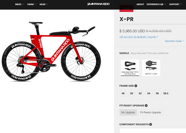 See that Fit Ready option in the configurator? I wrote about this about a year and a half ago. This is where you give QR your fit coordinates (just like you give our bike fit experts your coordinates for our bike fit assistance threads in our Reader Forum), and QR assembles the bike to those coordinates. You might not think this is a big deal until you have to cut or add cables or housing or hydraulic line to make a bike work once you adjust the bike at home. Then, QR ships you your bike either ready to assemble and hike your leg over in 30 minutes from the box arriving; or handed to you white glove delivery. If you don't know what size to buy in a QR tri bike go to the Quintana Roo Fit Assistance Thread on our Forum and you and I will work this out.