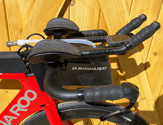 I’ll also change what’s on the front of this bike. I like full length forearm supports – always have – and have been riding them in one form or another on my bikes for a decade and a half. The rest of the world has caught up, thankfully, so I have some production options (I used to McGuyver my own aerobars). Profile Design is what comes on this build of the X-PR: the Wing 10A pursuit bar and Sonic 35a extensions. They work. But I have a different Profile Design option that I’ll show when I display this bike again in a couple of weeks built the way I ultimately prefer it for my own training and racing.