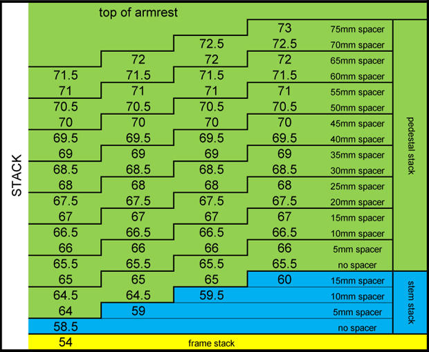 Above is a chart for the 54cm frame size. The numbers above are in centimeters, so, if I'm 630mm of Pad Stack (or Y), that's 63cm on the chart above. Pad Y is in the green shaded area, and the closest I can come is 64cm, as you see. Each step up (see how the green area is stepped, like a ladder?) are the pedestals or spacers (shown in an image above, alongside the stem); they are part of the stem system. You can gain your height either with these stem pedestals or by pedestaling the aerobar.