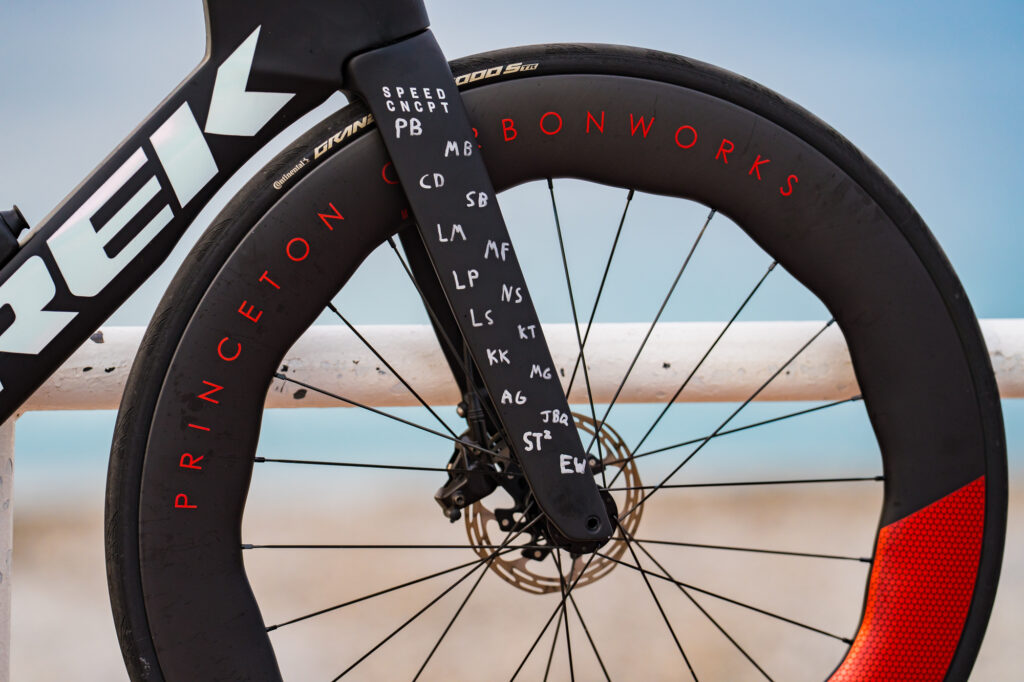 The Princeton Carbon Works 7580 front wheel is combined with the Blur 633 Disc. He’s riding Continental Grand Prix 5000 S TR tires – 25mm front, 28mm back with roughly 75 psi in each.