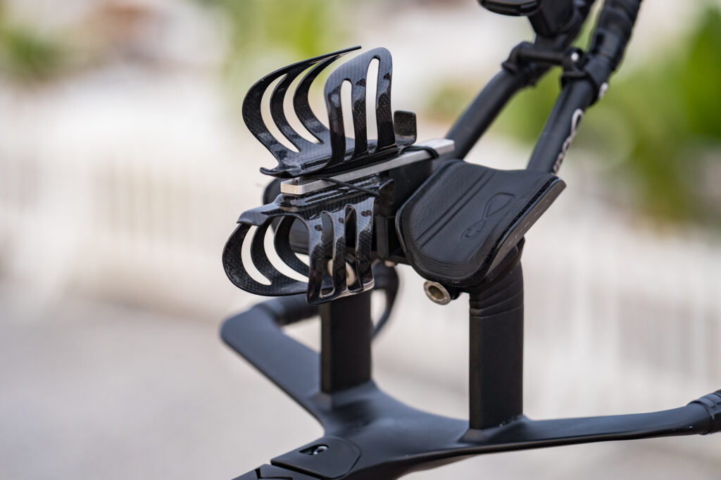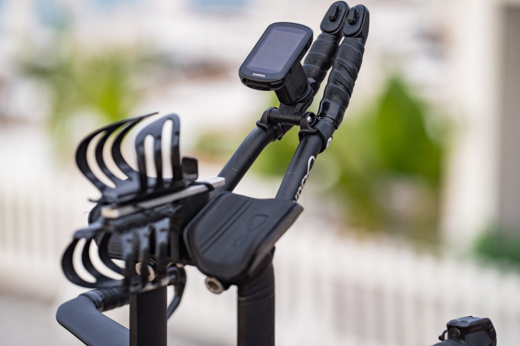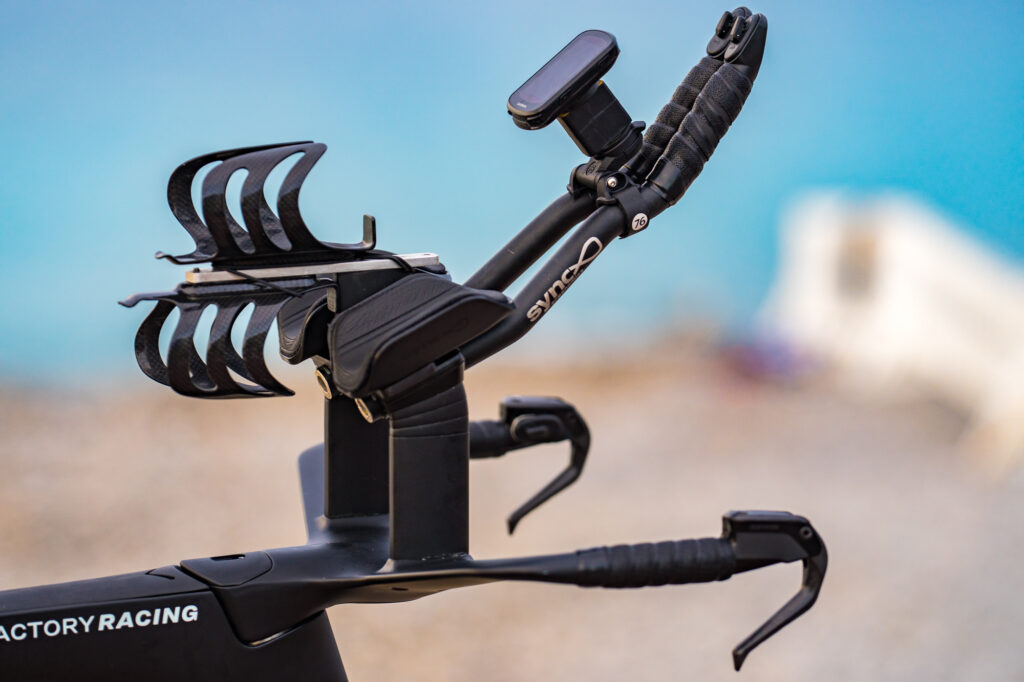 The Sync Ergonomic Aerobar has room for two water bottle cages up front, with his Garmin computer lined up front and centre.
