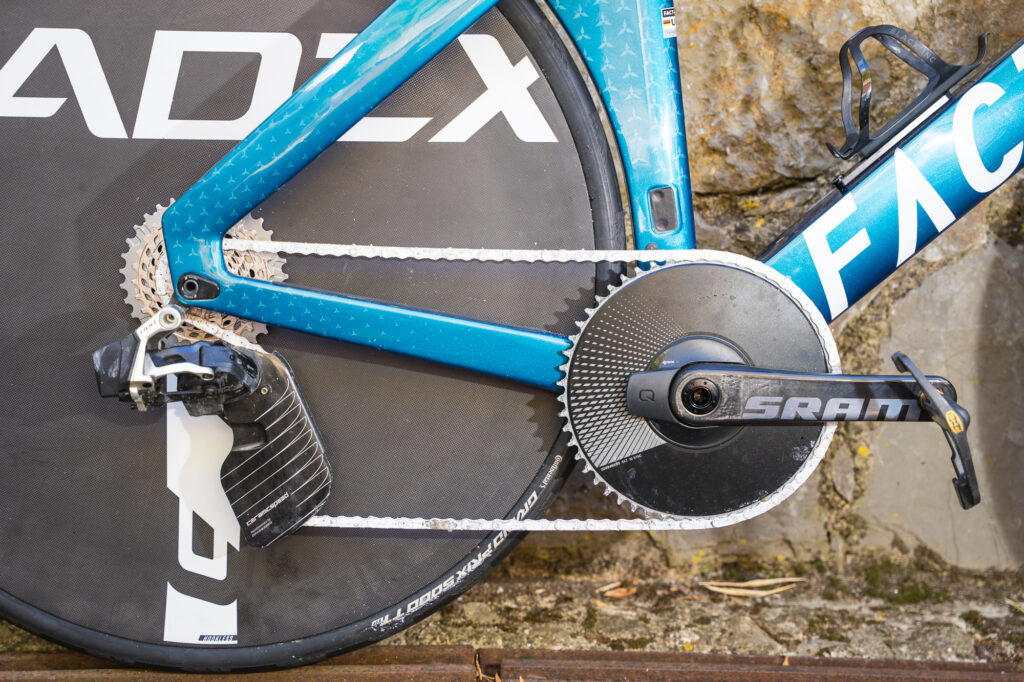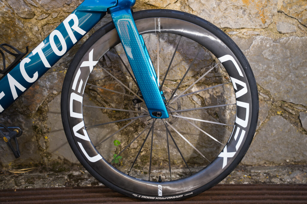 Von Burg has chosen to combine the Cadex Ultra 50 mm aero front wheel with the the Cadex Max Aero disc on the rear. The spoked front wheel is “a lot lighter than the 4-spoke I usually use.”