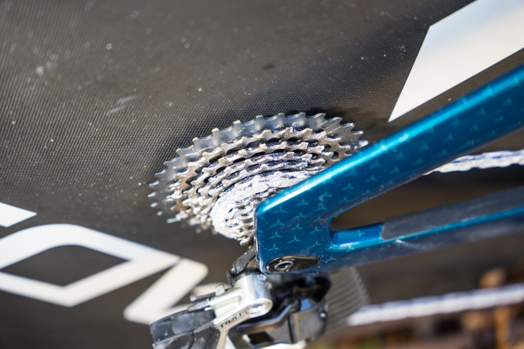 SRAM Red components are combined with CeramicSpeed pulleys and chain. Von Burg is running a 54-tooth 1x front chainring – “I usually would have a bigger 1x, but for all the climbing and the 10-33 cassette works quite well.”