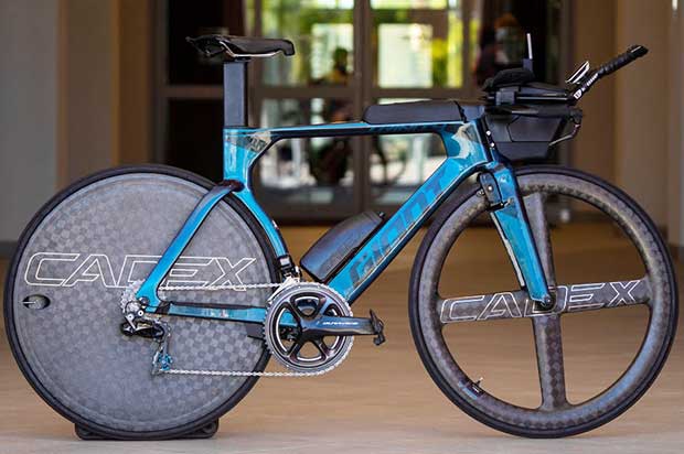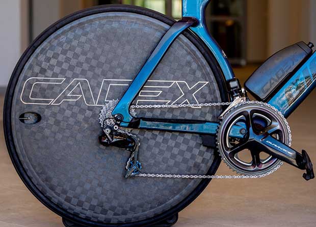 Sam was sent 2 sets of the same wheels – CADEX Four Spoke front and disc rear – one set for tubular (sew up) tires, and the other for tubeless tires. Sam chose tubeless.
