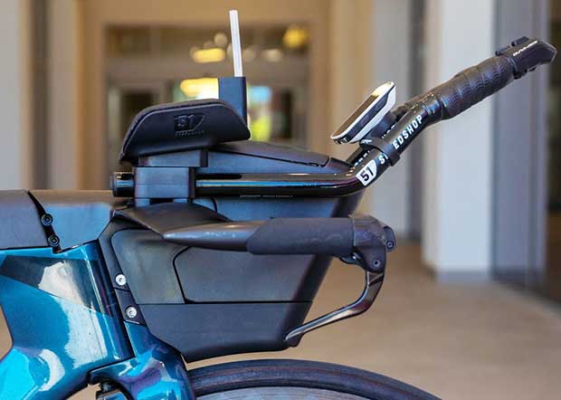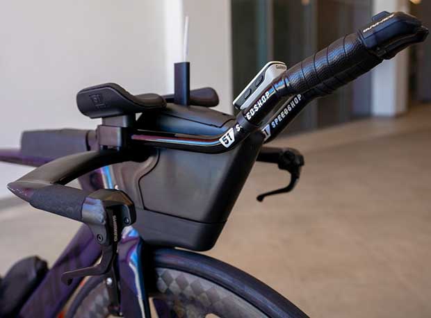 It looks like he’s got pretty traditional 2-button shifting at the ends. It looks like he’s using a Garmin 1080 head unit to pair with his Shimano power meter.