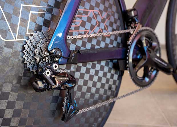 Sam is riding a pretty stock Shimano Di2 Dura Ace 2x system. The pedals appear to be Shimano’s PD-R9100 (Dura Ace level). If you look at that black dot right on the chainstay that you can see peek-a-boo through the spider arms, that’s part of Shimano’s R9100P power meter.
